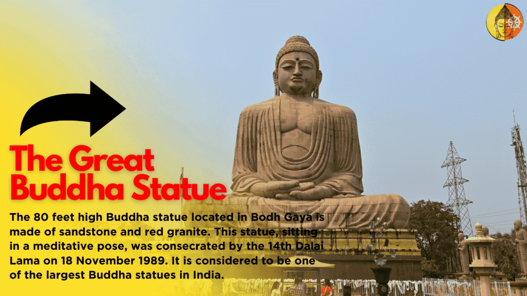 The Great Buddha Statue Located a short distance from the Mahabodhi Temple is this huge Buddha statue, which is about 18.5 metres (64 feet) high. It depicts Lord Buddha sitting in a meditative pose on a dome of red granite and sandstone. It was inaugurated in 1989 and has since become a landmark of Bodh Gaya.