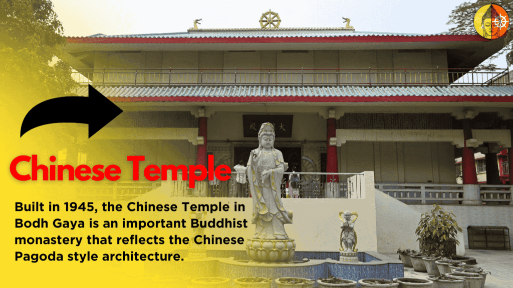 Chinese Temple is a famous Buddhist temple located in front of the Mahabodhi Complex in Bodh Gaya. This temple was built in 1945 with the cooperation of Chinese Buddhist monks and the Chinese government. During its construction, a combination of Chinese and Indian architectural styles is seen in it. This temple houses a 200-year-old Buddha statue brought from China and three magnificent golden Buddha statues. Every year, a grand event is organised here on Buddha Purnima, in which thousands of monks and devotees participate.