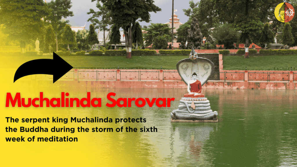 Muchalinda Sarovar is a sacred lake located near the Mahabodhi Temple complex. According to legend, Buddha spent his sixth week meditating here after attaining enlightenment. During a sudden storm at that time, the serpent Muchalinda of the lake protected Buddha with his hood. The statue of Buddha installed in the middle of the lake shows the serpent Muchalinda giving shelter to him under his hood, which shows the historical and spiritual importance of this place.