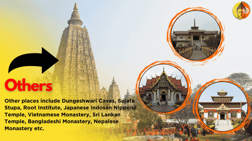 Other places include Dungeshwari Caves, Sujata Stupa, Root Institute, Japanese Indosan Nipponji Temple, Vietnamese Monastery, Sri Lankan Temple, Bangladeshi Monastery, Nepalese Monastery etc.