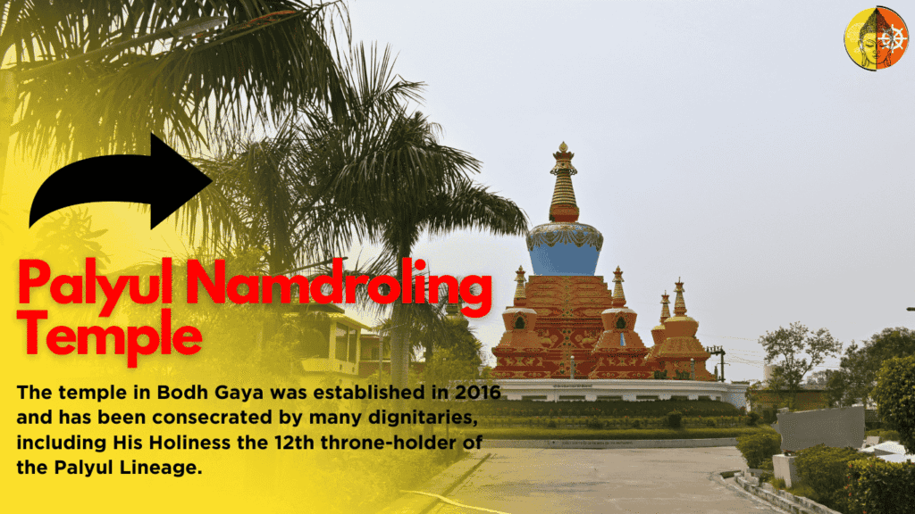 Palyul Namdroling Temple is a major monastery of the Palyul tradition of the Tibetan Nyingma path, the Bodhgaya branch of the famous Namdroling Monastery (Golden Temple). The monastery was founded by the Venerable Drubwang Pema Norbu Rinpoche. The monastery complex features temples decorated with traditional Tibetan architecture and colourful figures. There are huge Buddha statues, beautiful gardens, and meditation classes. The place is popular with both monks and travellers due to its peaceful atmosphere and teaching classes.