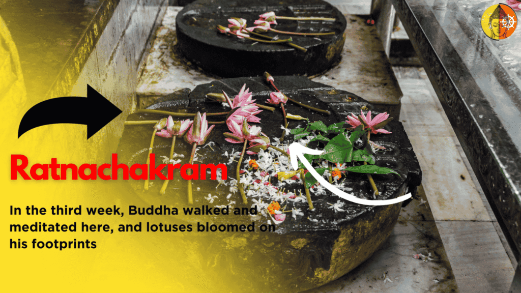 Ratnachakra is a sacred place located near the circumambulatory path of the Mahabodhi Temple, where the Buddha spent his third week meditating. Buddhist tradition also says that it was here that he performed his first miracle, when he miraculously made lotus flowers bloom, hence the place is called ‘Ratnachakra’ (a path adorned with gems).