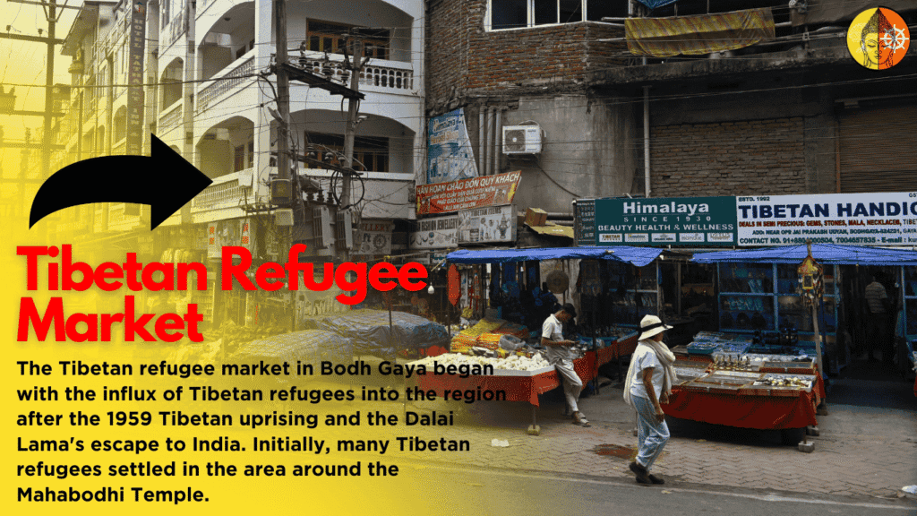 Tibetan Refugee Market Located at the northern end of the Mahabodhi Temple, this market opens every year from November to March. It sells a variety of artefacts of Tibetan culture – woollen jackets, shawls, hats, puja flags, silver jewellery, Buddha statues and other handicrafts. Both local and foreign travellers buy souvenirs and handmade items from here.